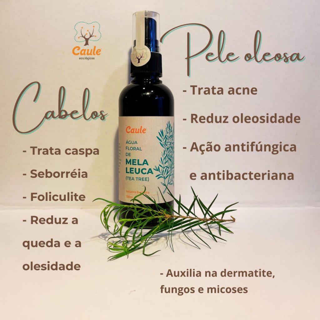 Primordialmente, a água floral da Caule é obtida durante o processo de extração do óleo essencial da Melaleuca. É certificada 100% natural.